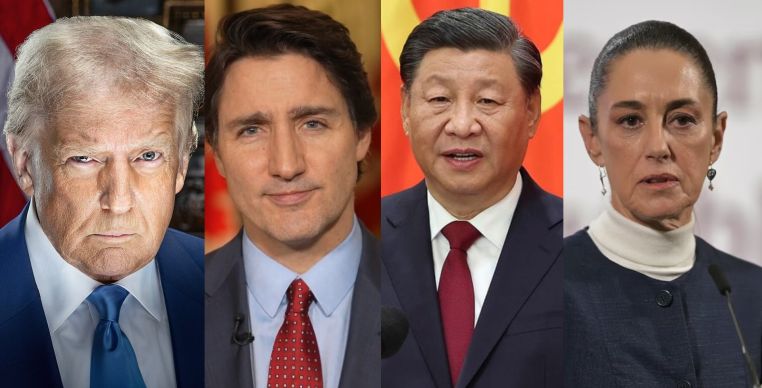 Presidente dos Estados Unidos, Donald Trump; o primeiro-ministro do Canadá, Justin Trudeau; o presidente da China, Xi Jinping; e a presidente do México, Claudia Sheinbaum