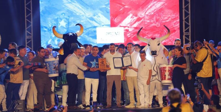 O presidente do Caprichoso, Rossy Amoedo, celebrou a força do povo da estrela na testa: “A gente se sente muito feliz, o povo parintinense, o povo Caprichoso, fazedores de cultura, que têm um suporte incrível como esse para que a gente possa colocar a nossa arte, o trabalho e a dedicação de todos aqueles que fazem o povo Caprichoso”.