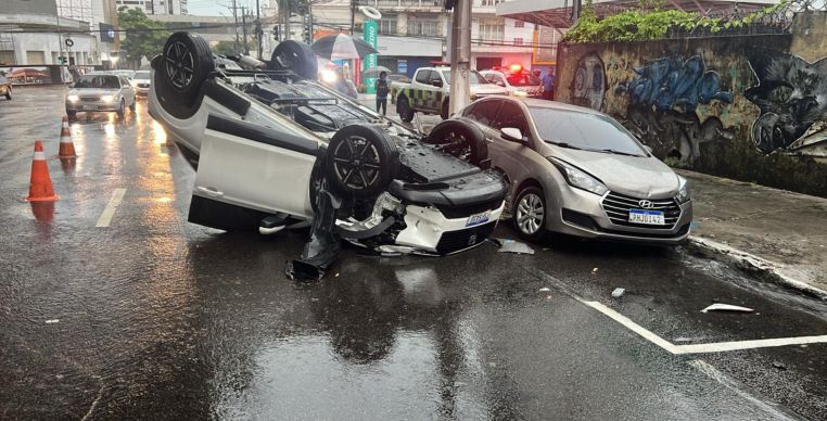 Um acidente foi registrado na manhã desta segunda-feira (16) na avenida Joaquim Nabuco, no Centro, zona sul de Manaus. Um carro modelo Honda HR-V EXL, de cor branca, ficou capotado na via após perder o controle durante a forte chuva que atinge a capital. Outro veículo, um Hyundai HB20S 1.6A Comfort, sofreu danos na lateral.