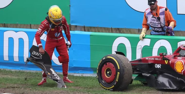 A chuva que chegou tímida ao GP da Holanda neste domingo foi suficiente para provocar a primeira desistência de Lewis Hamilton desde que estreou pela Ferrari. O heptacampeão mundial perdeu o controle do carro na curva 3 de Zandvoort, a Hugenholtz, trecho mais inclinado do circuito, com 19 graus de inclinação, e bateu ainda no início da prova.