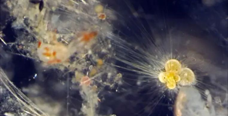 Foraminífero vivo da espécie Globigerinella calida, coletado no sudoeste do Oceano Índico. As longas extensões ao redor da concha são tentáculos usados para locomoção e alimentação.