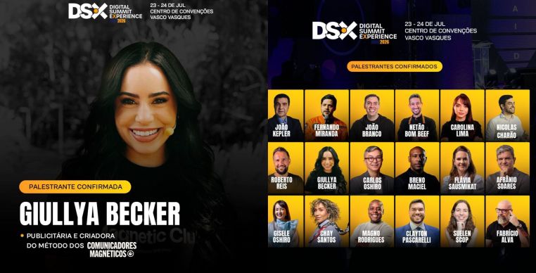 A especialista em comunicação digital Giullya Becker será uma das palestrantes do DSX Digital Summit Experience 2026, que acontece nos dias 23 e 24 de julho, no Centro de Convenções Vasco Vasques, em Manaus. Com mais de 621 mil seguidores nas redes sociais e um método que já formou mais de 2 mil alunos, ela levará ao evento uma abordagem prática sobre como transformar conteúdo em vendas.