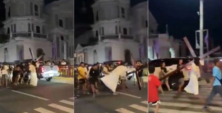 Visivelmente irritado, o ator que representava Jesus pulou para trás, entregou a cruz a outra pessoa e, em seguida, desferiu um chute no homem que o atrapalhava. Após o momento de tensão, ele retomou a caminhada e continuou a encenação como se nada tivesse acontecido.