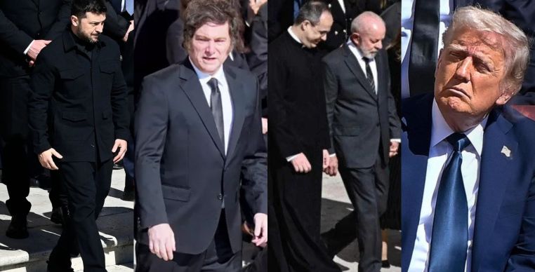 Na sequência, vieram as comitivas dos demais chefes de Estado, também organizadas pela ordem alfabética em francês, incluindo a do Brasil, com o presidente Lula e a primeira-dama Janja, e a dos Estados Unidos, com o presidente Donald Trump, em sua primeira viagem internacional desde que assumiu a Casa Branca. O ex-presidente americano Joe Biden também compareceu à cerimônia, sentado apenas algumas fileiras atrás de Trump.