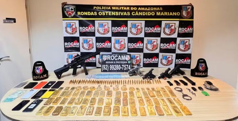 A Secretaria de Segurança Pública do Amazonas (SSP-AM) confirmou nesta quinta-feira (30) a maior apreensão de ouro já registrada no estado. Ao todo, 77 barras do metal, somando 72,6 quilos e avaliadas em cerca de R$ 45 milhões, foram encontradas durante uma operação da Rondas Ostensivas Cândido Mariano (Rocam), em Manaus. Seis pessoas foram presas, incluindo dois policiais militares e um policial civil, todos fora de serviço.