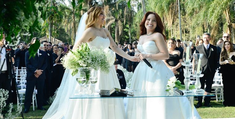 Mari Fernandez e Júlia Ribeiro oficializaram a união na última terça-feira (14) em uma cerimônia repleta de emoção e luxo realizada em uma fazenda no interior de São Paulo. As noivas escolheram vestidos brancos para o momento especial, em uma celebração intimista que contou com familiares, amigos e diversas personalidades do meio artístico.