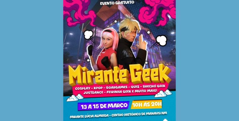 Manaus recebe, entre os dias 13 e 15 de março, o Mirante Geek, evento gratuito que celebra a cultura pop, os games, os animes e o cosplay. A programação será realizada no Mirante Lúcia Almeida, das 10h às 20h, reunindo diversas atividades voltadas ao público geek e à comunidade criativa local.