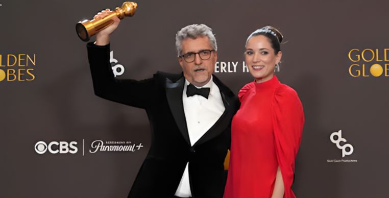 Kleber Mendonça Filho e Emilie Lesclaux celebram a conquista do Globo de Ouro de Melhor Filme de Língua Não Inglesa.