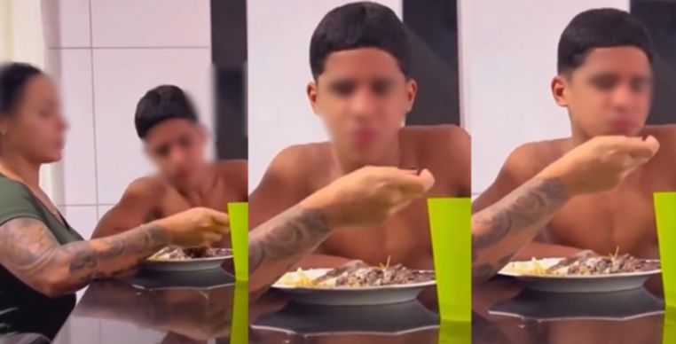 Um vídeo compartilhado nas redes sociais tem gerado repercussão ao mostrar uma mãe alimentando o filho de 16 anos diretamente na boca, situação que foi registrada pelo pai do adolescente. Nas imagens, o homem demonstra incômodo com a cena e questiona as consequências do comportamento na formação do jovem.