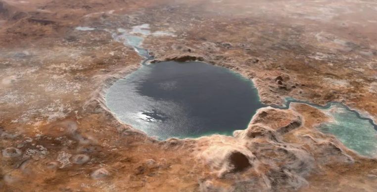 A ilustração mostra como pode ter sido a cratera de Jezero no passado, uma região de Marte que pode ter abrigado água há bilhões de anos.