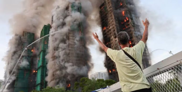 O fogo começou na tarde de quarta-feira e atingiu várias torres do conjunto residencial em Tai Po. Autoridades afirmam que as chamas podem ter se espalhado por estruturas externas de reforma feitas com andaimes de bambu.
