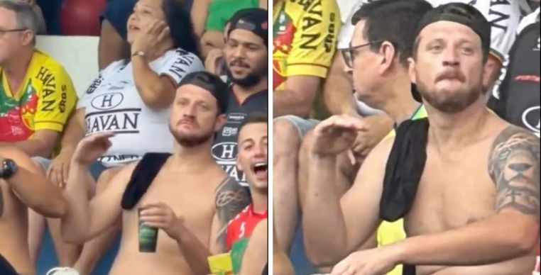 Em vídeos que circulam nas redes sociais, é possível ver o homem sentado na arquibancada destinada à torcida do Brusque. Ele segura um copo com uma das mãos e, com a outra, faz movimentos simulando um avião em voo. Em determinado momento, ele inclina o corpo, cambaleia e reproduz o gesto de queda, em alusão ao acidente.