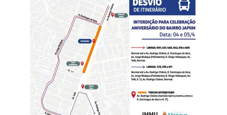 A Prefeitura de Manaus, por meio do Instituto Municipal de Mobilidade Urbana, informou que haverá desvio no trânsito na avenida General Rodrigo Otávio Jordão Ramos, no sentido bairro/Centro, neste fim de semana, dias 4 e 5 de abril, por conta das comemorações de aniversário do bairro Japiim.