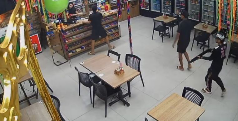 Logo em seguida, os outros dois homens entram no comércio. Um deles aparece com um objeto semelhante a uma arma. Até o momento, não há confirmação se o item utilizado era uma arma de fogo verdadeira ou um simulacro. A presença do objeto intimidou a funcionária, que não reagiu à abordagem.