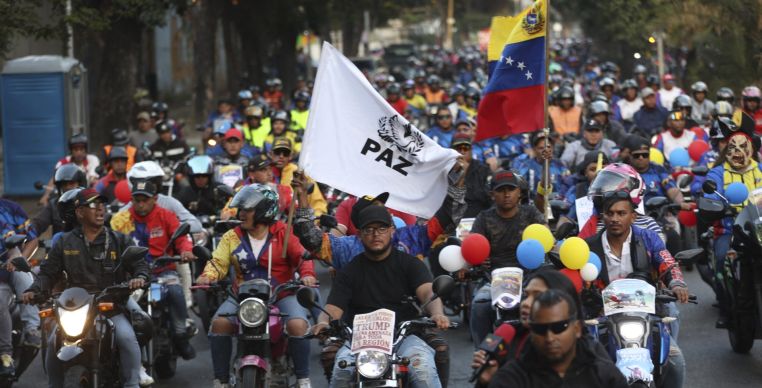 Motociclistas que apoiam o presidente venezuelano Nicolás Maduro participam de uma manifestação em Caracas em protesto contra a pressão militar dos Estados Unidos.
